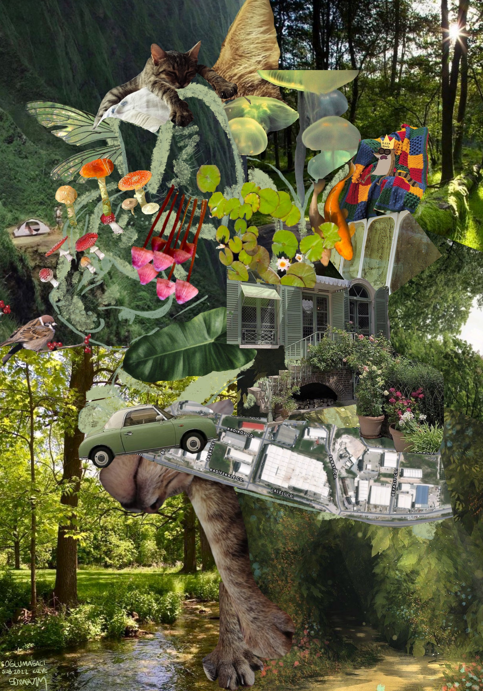 Kolaj yapmayı ilk aklıma koyduğumda okuduğum tüm edebiyat dergilerini kırpmaya başladım. Bütünden parçaya değil parçalardan bütüne gidiş var ilk çalışmamda. Fondaki fotoğraf Hollanda’dan dönüş uçuşumda büyük bir hayranlıkla tarafımca çekildi.